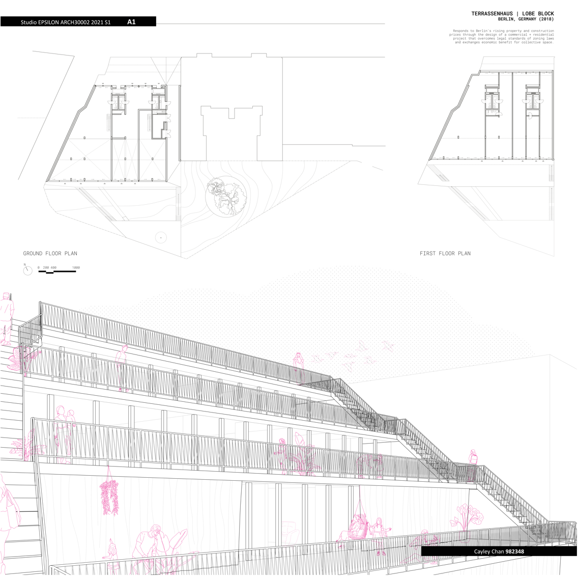 The precedent project that I explored was Terrassenhaus, also known as the Lobe Block, built in Berlin, Germany in 2018. This project responds to Berlin’s rising property and construction prices by converting a former scrapyard into a commercial and residential building, exchanging economic benefits for collective space. By including aspects of commercial usage into the building, it was able to overcome legal standards of zoning laws, creating affordable, community-centered housing.