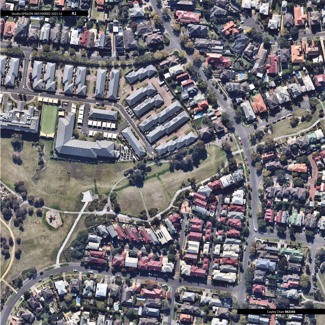 A key element of the area is the retirement village in the middle left, which while being a gated community, serves a model for a micro-community, in which sporting facilities like a tennis court and social facilities like the community hall gather residents and heighten interaction while having their own autonomous dwellings which they can recede to. This gated community also serves to facilitate wider social interaction by encouraging family members and other visitors to enter, a large amount of car parking facilities are featured within the gated area, suggesting a welcoming of visitors.